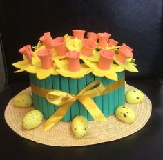 All the flowers are on top and tied together. And yellow eggs line the brim.