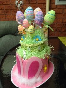 Well, the Easter eggs are all on sticks. And they’re all in basket atop the bunny hat.