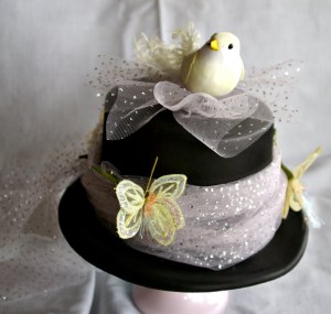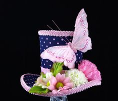The brim is trimmed with pink. Includes flowers and a pink butterfly.
