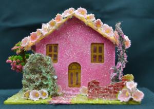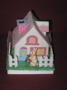 The roof is of golden paint. Comes with pink bunnies and a basket of Easter eggs.