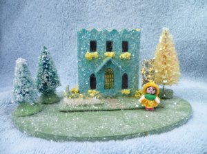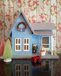 This one is blue with a yellow roof and front door. Includes bunnies, chicks, and an Easter egg tree.