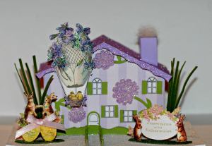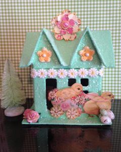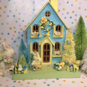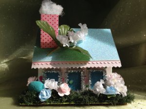 This one has images of chicks and bunnies taken from cards. Even has flowers between the windows.