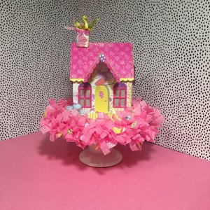 Has a cross on top and over the doorway. A small chick is near the glitter wall.
