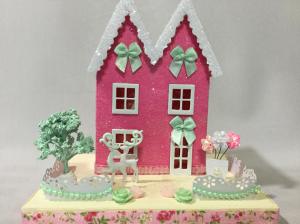 Has pink trees at the front with a rabbit. Like the wreath near the roof though.
