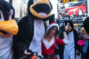 The guy even wears one with presents and snowflakes. She just wears a red Santa coat with a red strapless top.