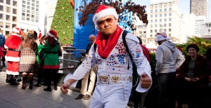He’s dressed in a mashup of Santa and Elvis. And yes, he’s brimming with rhinestones.