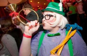 One guy wears a white clown wig. Also has chains over his Santa suit and green shirt.