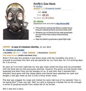 Of course, it wouldn’t. The product description makes it perfectly clear it’s for a Halloween costume and isn’t supposed to function like a real gas mask. But this reviewer didn’t get the memo.