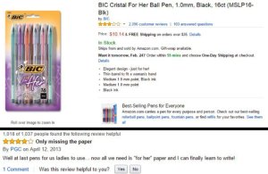 I guess this is a play on Bic’s ridiculous idea as if women couldn’t write until they got their own pens. Besides, as a woman, I’ve used regular Bic pens for years.