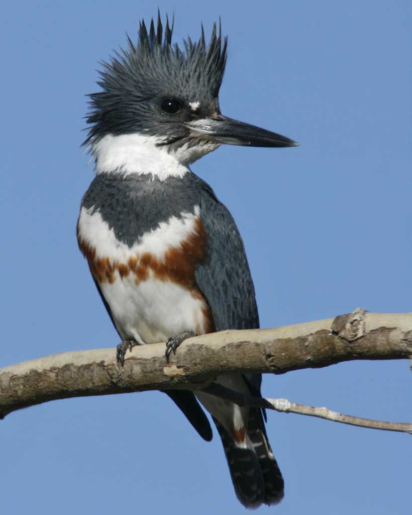 The Belted Kingfisher always seems to have an air of self-importance while patrolling up and down rivers and shorelines. It’s also one of the few species where the female is more colorful than the male. As you’ve seen in most bird species, this isn’t the case.