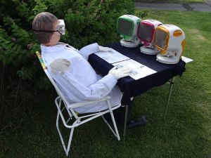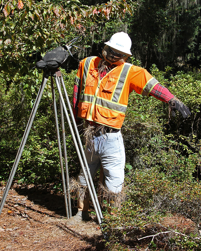 Well, I have put up a Waldo scarecrow before. Yet, this one comes with a walking stick and solar powered binoculars.