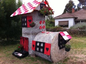 This is a scarecrow of Alice in Wonderland. Includes the White Rabbit and the Cheshire Cat.