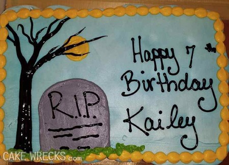 I know we must all die someday. But is really all right to bring this up on a 7-year-old girl’s birthday cake? Sure she may have a birthday near Halloween but still. I’m not sure a tombstone cake is a good idea.