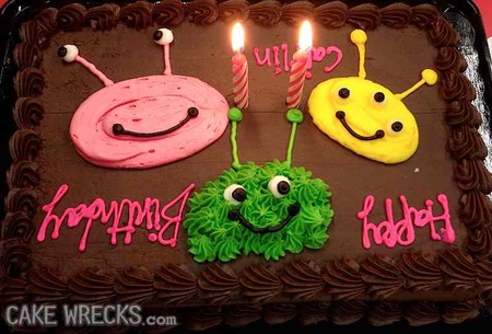 Now the space aliens on this cake are find. It’s just that the cake decorator seemed to think their faces were upside down, and thus that’s why the writing is what it is. Still, the kid’s 2 so it’s not like he’ll notice anyway.