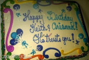 Then there are some cake decorators who write on the cakes everything they heard on the phone as well. Still, at least this one followed directions, but maybe a little overboard.