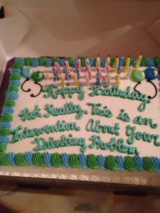 Seriously, if you were going to stage an intervention about someone’s drinking problem, I’d sure as hell wouldn’t think writing it on the cake is a good idea. Just saying.
