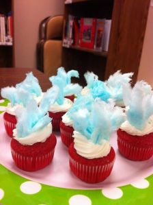 Okay, these cupcakes are supposed to imitate Thing 1 and Thing 2. The cotton candy gives the impression of their blue hair.