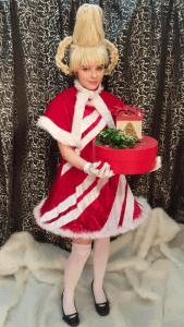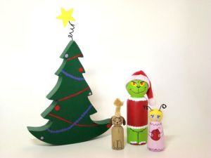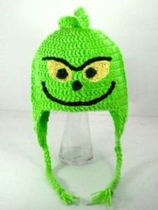 Depicts the Grinch in a Santa hat. And yes, he’s bent on stealing Christmas since he’s fed up with holiday consumerism.