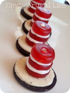 The hats here consist of red icing and marshmallows. Yet, all make a fantastical Seuss treat.