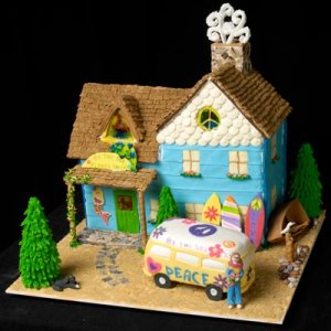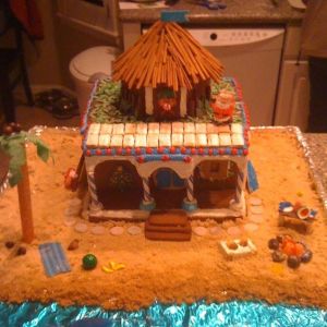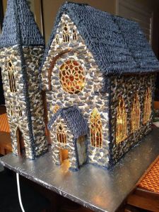 this one has stones on the facade. The roof is covered with Chex cereal.