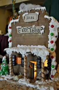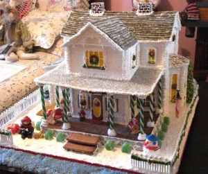 This one has holly on the windows. The silo is covered with pretzels. The path consists of Chex.