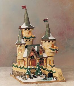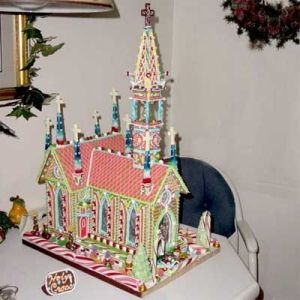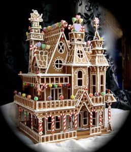 Is decked with peppermints, gumdrops, and candy canes. Has 2 red and green towers.