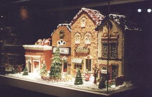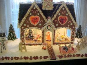 This one has a uniquely candy roof with chocolate chips on top. Wreaths deck the windows.