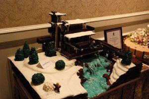 This one has white chocolate flower pretzels decorated as snowflakes. Also has 2 towers in the back.