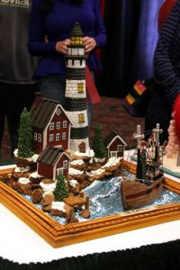 This one is covered in red and white candies. A wreath dons the lighthouse and cabin doors.