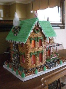 This one is made from pretzel sticks stacked against each other. A snowman sits in the lawn.