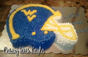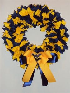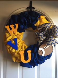 Has blue and yellow ribbons. Includes football, helmet, and yellow WVU letters.
