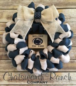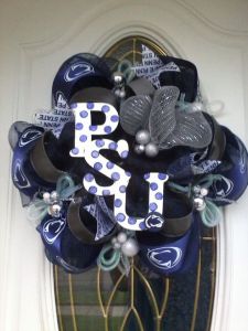 It’s a blue Penn State decomesh wreath in blue and white. Includes football decorations for the Nittany Lions.