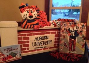 Has blue, white, and orange ribbons wrapped around it. Includes felt flowers and the Auburn logo.