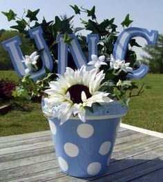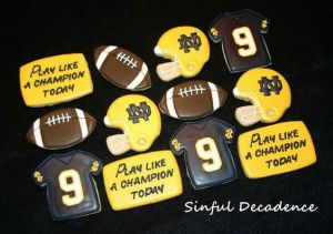 Has ribbon and football decorations. The N and D are yellow with blue polka dots.