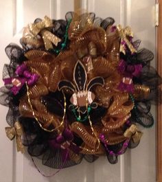 This one has baubles of various sizes and colors with gold decoration. Perfect for any front door during the Christmas season.
