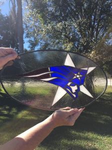 It lights up with blue and purple foliage. Love the peacock feathers on the top. So pretty.