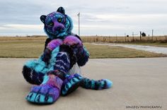 This one has big paws on their feet with bright blue claws. Wonder how they sit with that costume on.