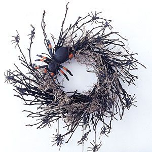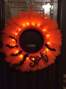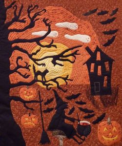 Has jack-o’-lanterns outside. While bats inhabit the black bare-limbed tree.