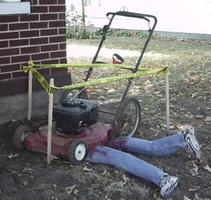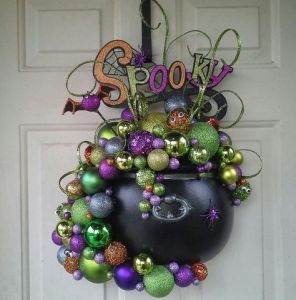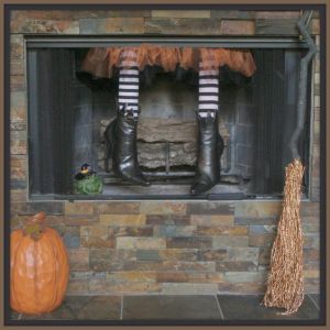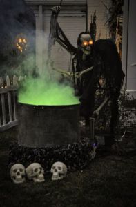 Has some witch legs sticking out of a cauldron. The door and lawn are also decorated with jack-o’-lanterns.
