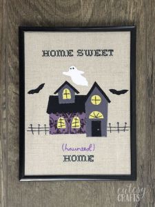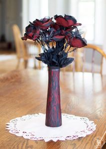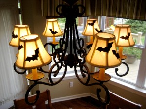 It’s made from paper with a bare-limb tree and tombstones. Bats fly from the chimney.