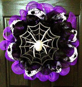 This one has a bat on the roof. Spiders cover the trees. While a jack-o’-lantern sits in the front.