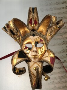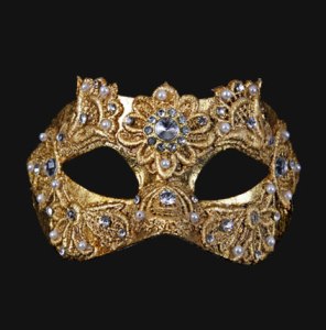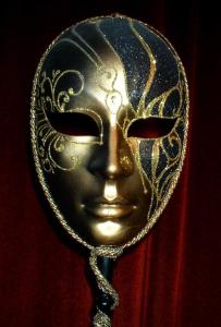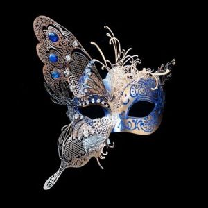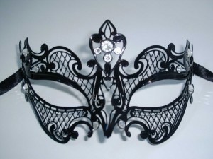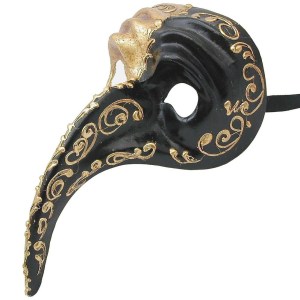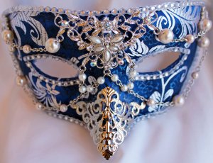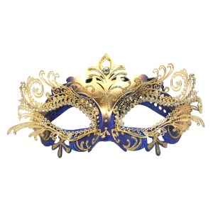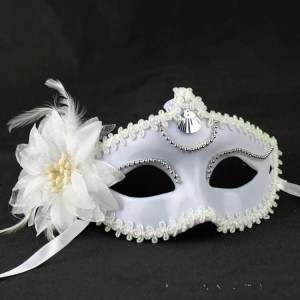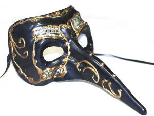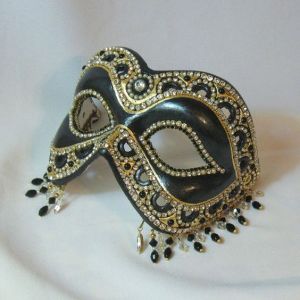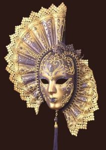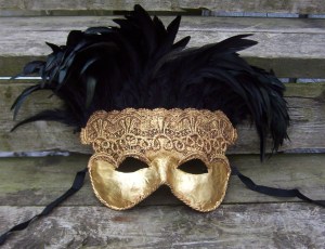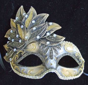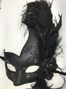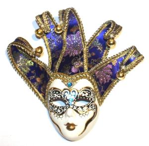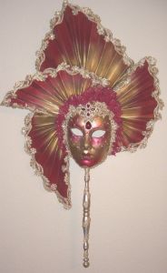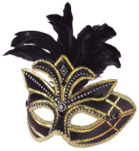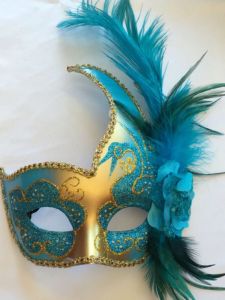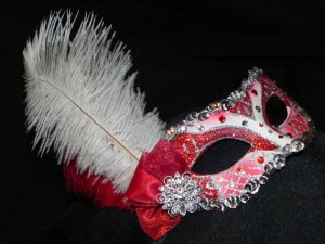 This one has feather masks of many different colors. Has a crown on top.