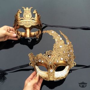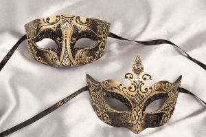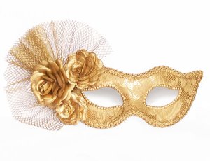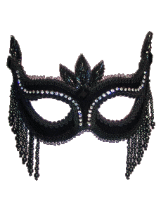 Contains masks, sequins, and crowns. Trimmed with fringe.