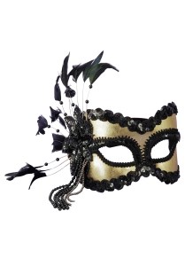 Has a gold fleur de lis sitting on top. Includes gold Mardi Gras beads and black feathers.