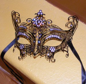 Okay, the images are more or less made out of sequins. Consists of masks and fleur de lis. Love the purple feathers.