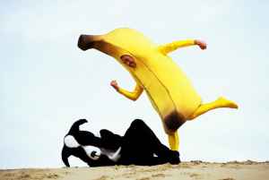I kind of feel bad for the dog here. I mean how is anyone going to take him seriously after getting the crap beat out of him by a guy in a banana costume?