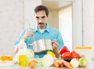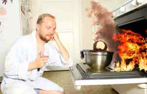 The smoke detector is on the fritz like crazy. But instead of getting the fire extinguisher or calling the fire department, he’s watching the stove burn with a glass of wine.