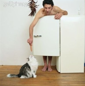 Notice how the fridge door is conveniently placed over him. Just so he can give his cat some meat.