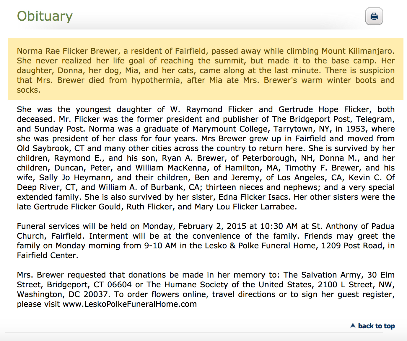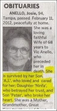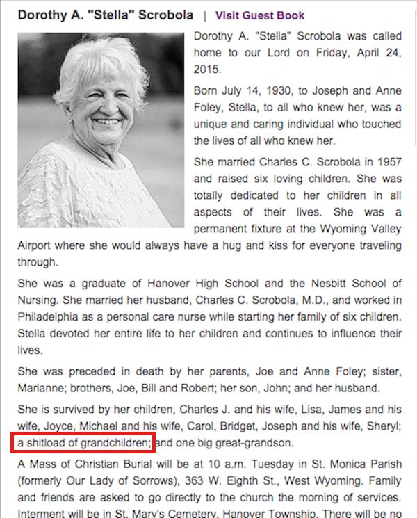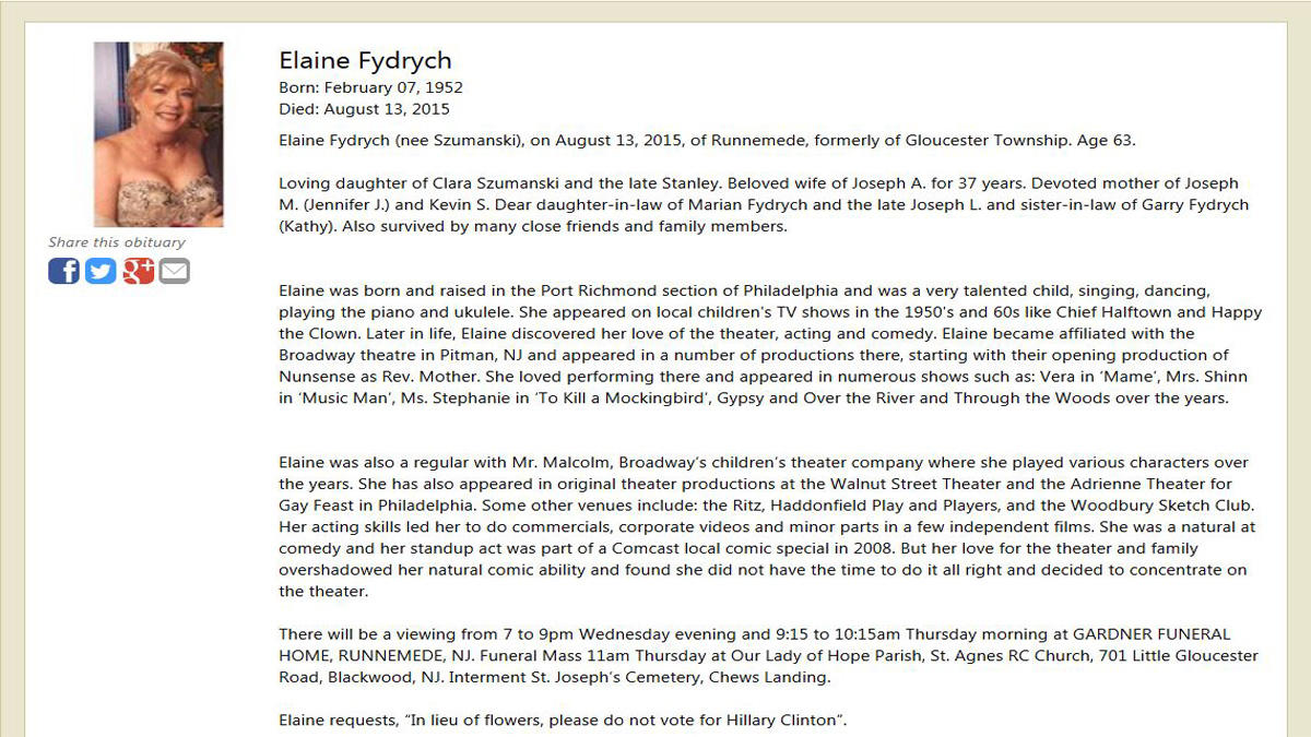 29. Our apologies to Mrs. Letterman as reports of her passing were greatly exaggerated.