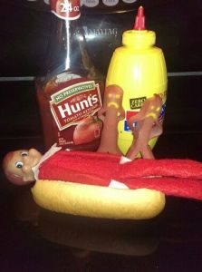 Here he’s fastened onto a door with band-aids. Don’t really want to know what happened here.